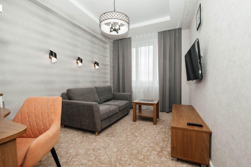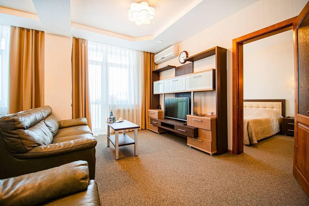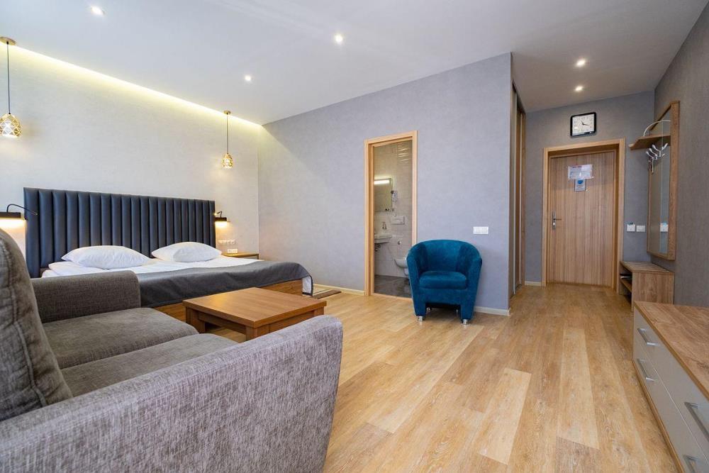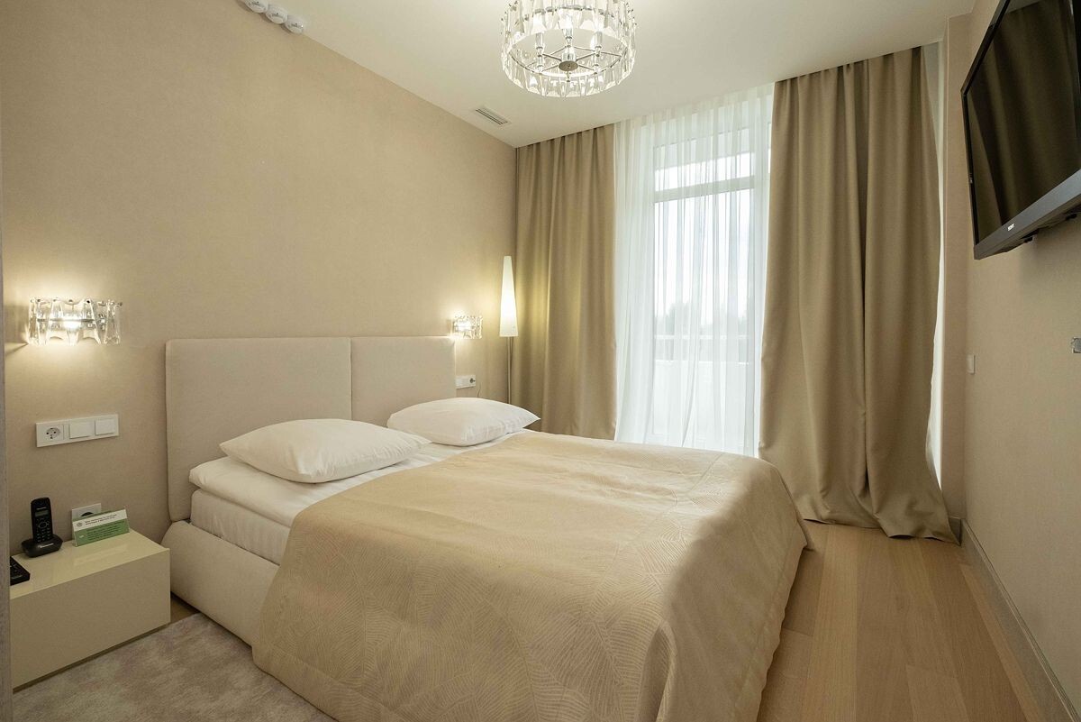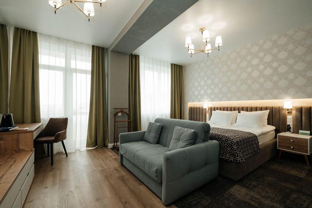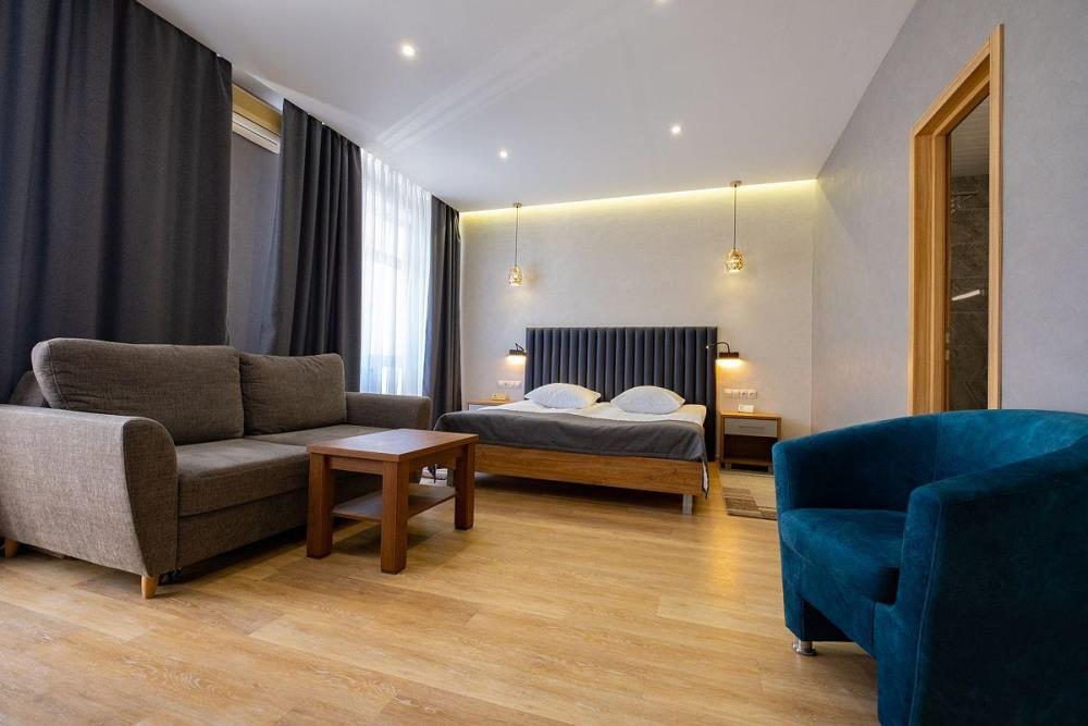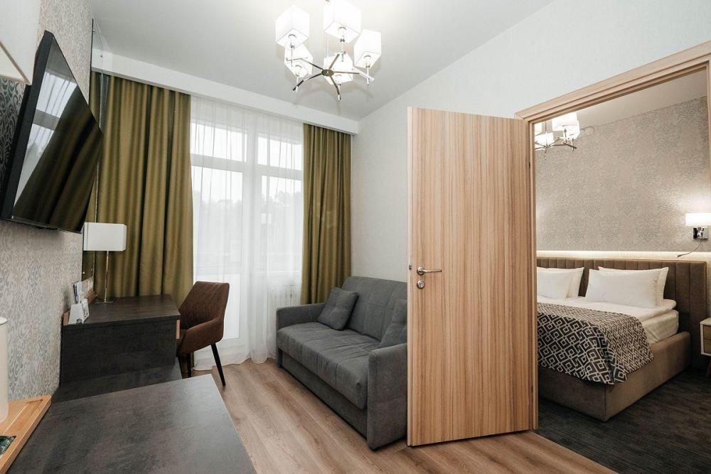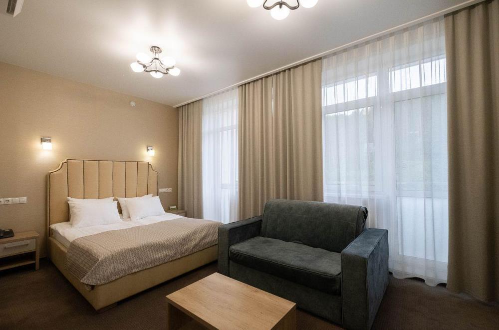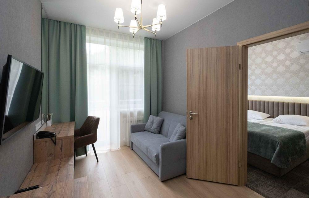 Просторный двухкомнатный номер с балконом, оснащенный всем необходимым для комфортного отдыха. Номер разделен на светлую гостиную и уютную спальню. Подходит для размещения до четырех гостей. Номер располагает двуспальной кроватью (160 см), для дополнительных мест предусмотрен раскладной диван.