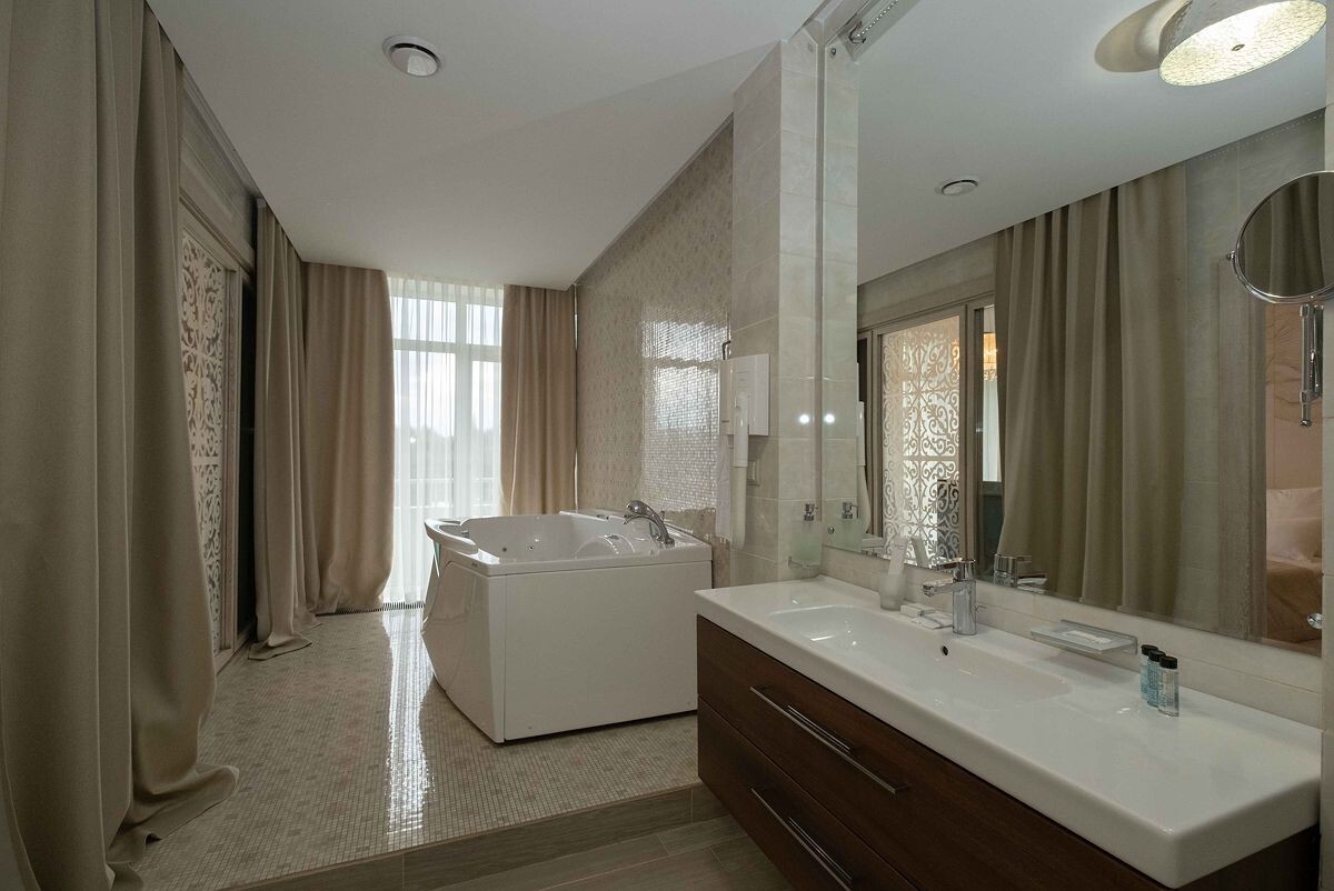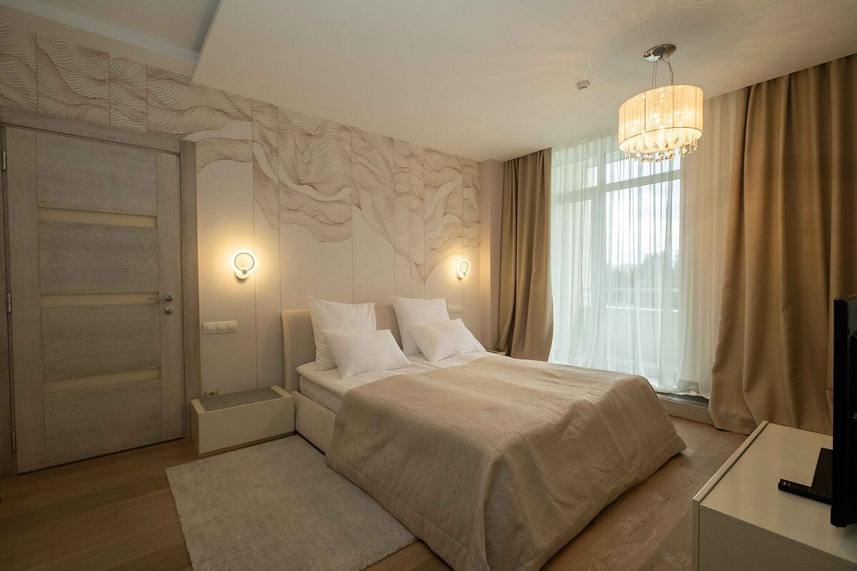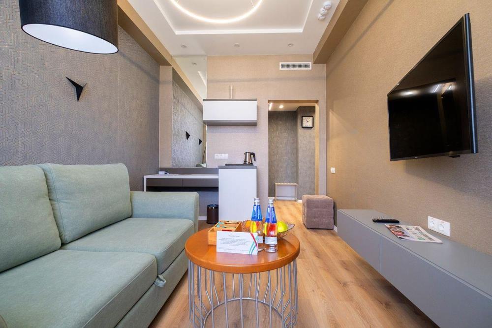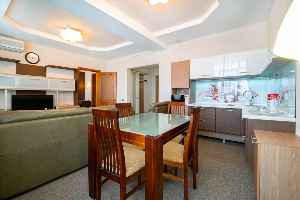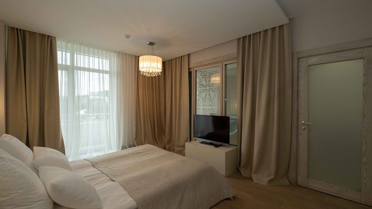 Роскошные апартаменты предназначены для отдыха премиального уровня. Элегантный номер предлагает гостям просторную гостиную с кухонной зоной и уютной спальней. Подходит для комфортного размещения до пяти гостей. Номер располагает двуспальной кроватью (160-180 см), для дополнительных мест предусмотрен раскладной диван и еврораскладушка.